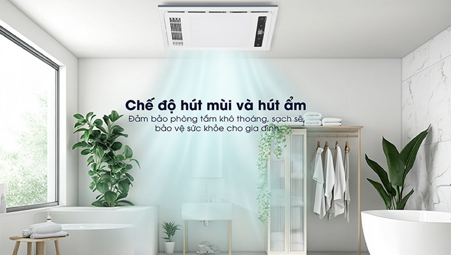 Chế độ hút mùi giúp loại bỏ hoàn toàn mùi hôi và hơi ẩm khó chịu, đặc biệt trong những ngày thời tiết nồm ẩm. Đồng thời giữ cho phòng tắm luôn khô thoáng, sạch sẽ, hạn chế sự phát triển của nấm mốc bằng cách loại bỏ hơi ẩm ra khỏi phòng tắm, đảm bảo sức khỏe cho cả gia đình.